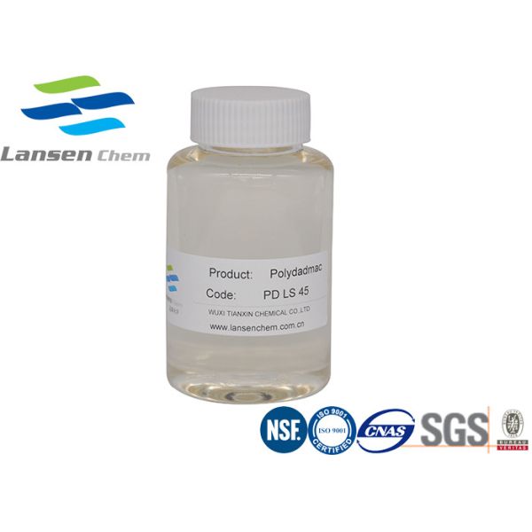 PolyDADMAC is a cationic quaternary ammonium polymer which is completely dissolved in water, it contains strong cationic radical and activated adsorbent radical, which can destabilize and flocculate the suspended solids and the negative-charged water soluble matters in the wastewater through electro-neutralization and bridging adsorption. It achieves good results in flocculating, de-coloring, killing algae and removing organics.